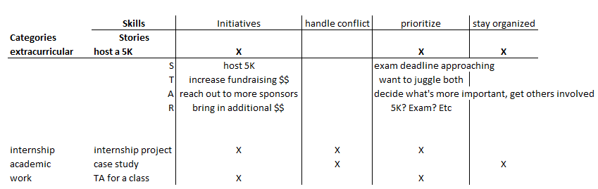 After “Tell me about yourself”, recruiters usually will ask behavioral questions. As a greeter for on-campus interviews (company representatives who interviewees could talk to before the interview), I remember vividly that one interviewer commented “I wish he could speak to more than fundraising for his fraternity!” Truth be told, I used to be that applicant who couldn’t stop talking about organizing a 5K event. As I could completely relate to, during the interview, you get nervous and do not have extra time to consider the portfolio of stories. To avoid this issue, develop a list of stories that covers various aspects of the college life, such as internship, part-time job, extracurricular, and class project. You could build a grid that looks like this: